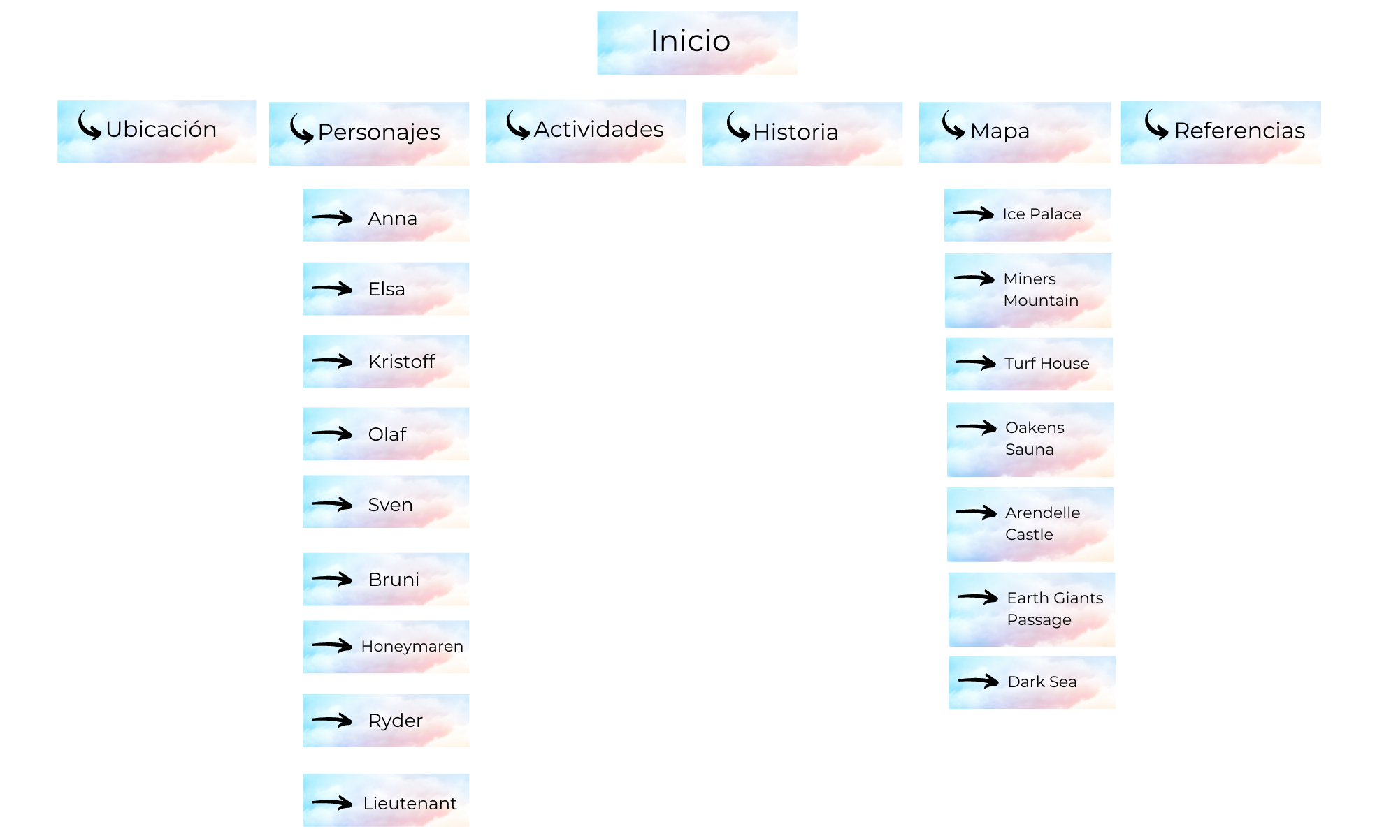 Arendelle es el Reino mágico donde viven Elsa y Anna, las protagonistas de las peículas de Frozen, y en esta página se presenta una descripción y resumen de las características del reino, así como de sus lugares principales. En la sección de ubicación se detallan el lugar y sus características físicas. En la de habitantes, se listan los personajes de las películas. Para las actividades, se describen los cortos animados que ha hecho Disney con base en la película. En el apartado de historia, se muestra la historia de la segunda película contada por el rey Agnar. También se incluye una página con un mapa interactivo que muestra las escenas destacadas de los principales lugares de Arendelle. Está construida con HTML, CSS y JavaScript, y cuenta con un diseño responsive para adaptarse a diferentes tamaños de pantalla.